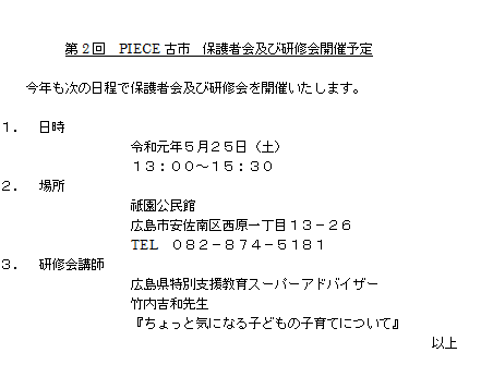 『第2回 PIECE古市 保護者会及び研修会開催予定』