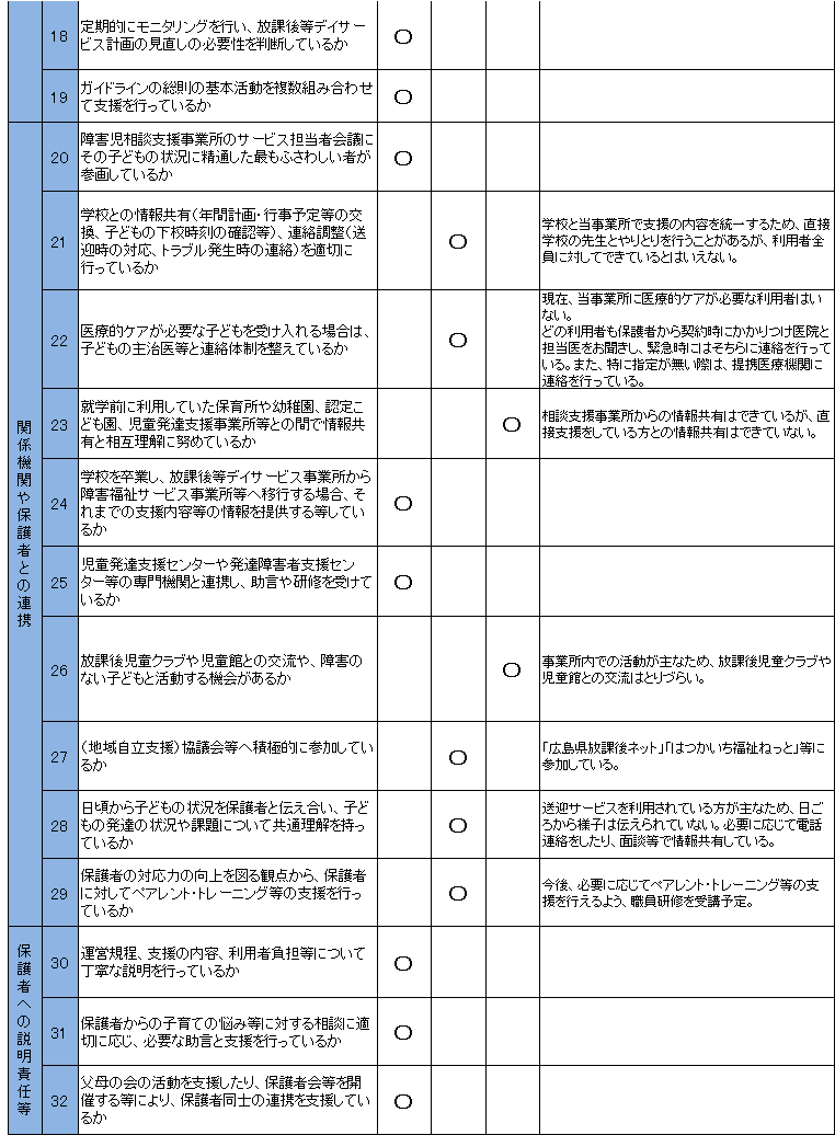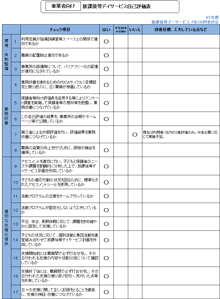 この自己評価表は、支援の質の向上のため、厚生労働省のガイドラインに沿って作成されたものです。