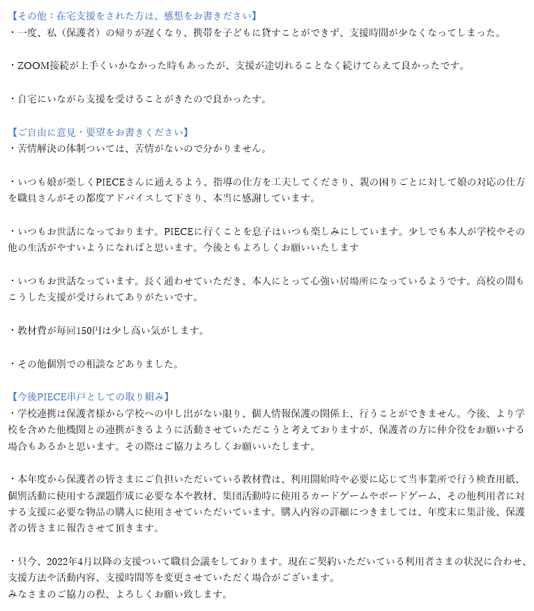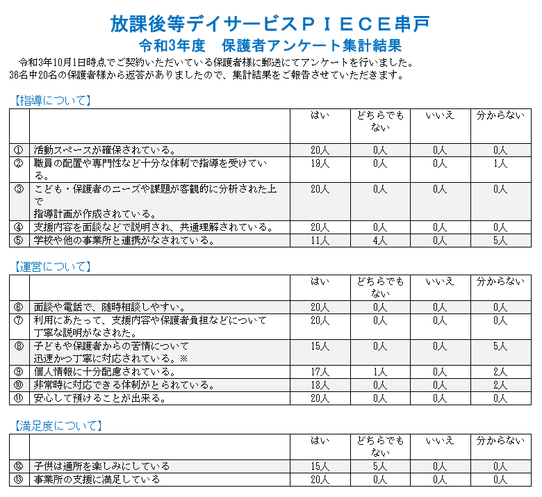 【PIECE串戸】R3年度保護者アンケート結果のご報告