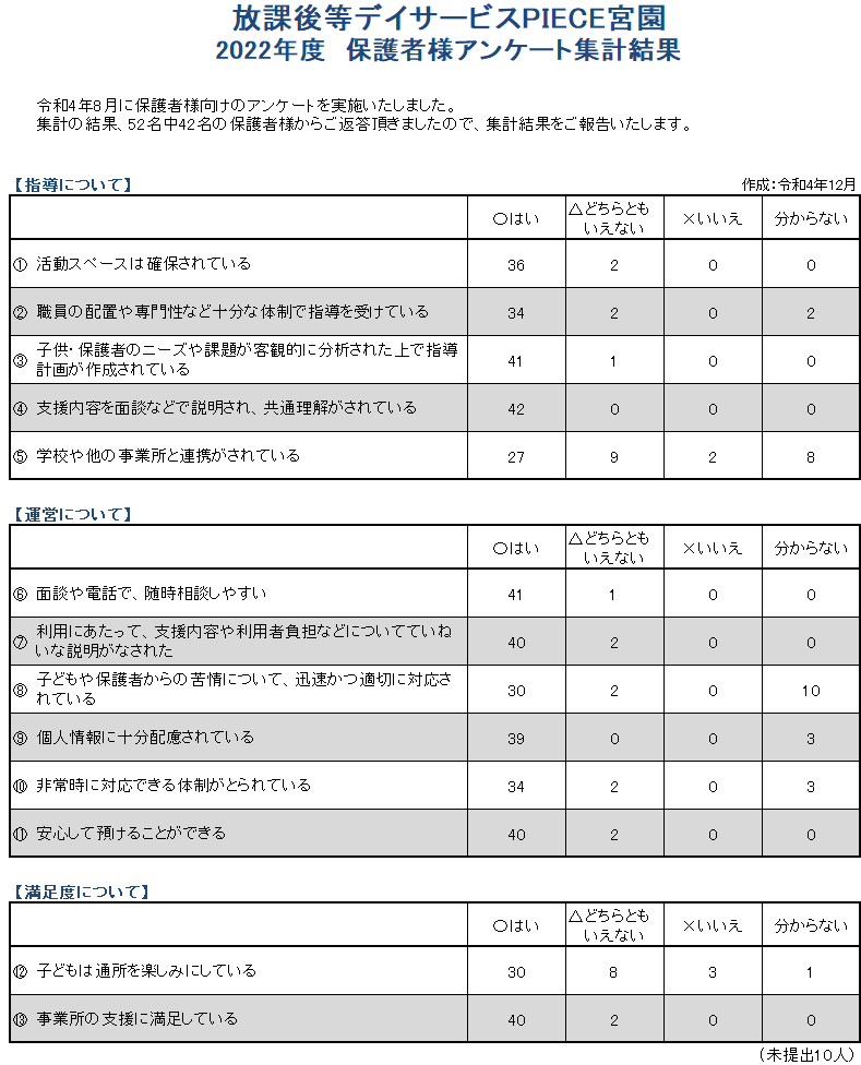【PIECE宮園】R4年度保護者アンケート結果のご報告