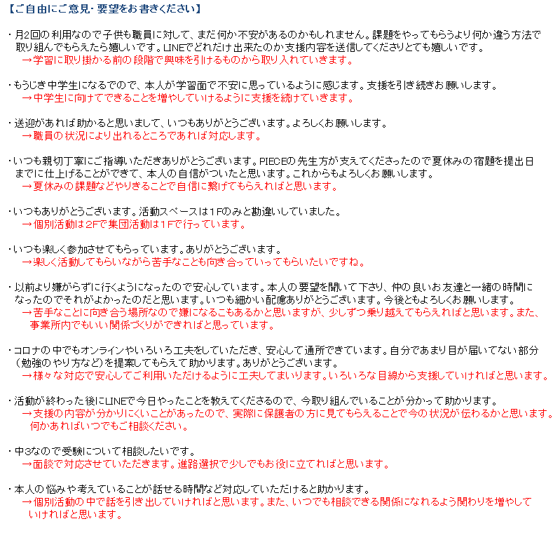 様々なご意見やご感想ありがとうございます。職員間で共有し今後の支援に生かして