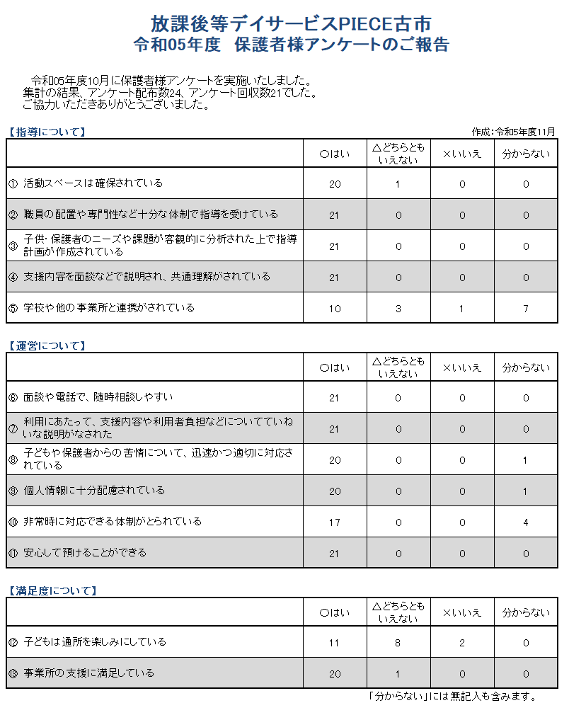 【PIECE古市】R5年度保護者アンケート結果のご報告