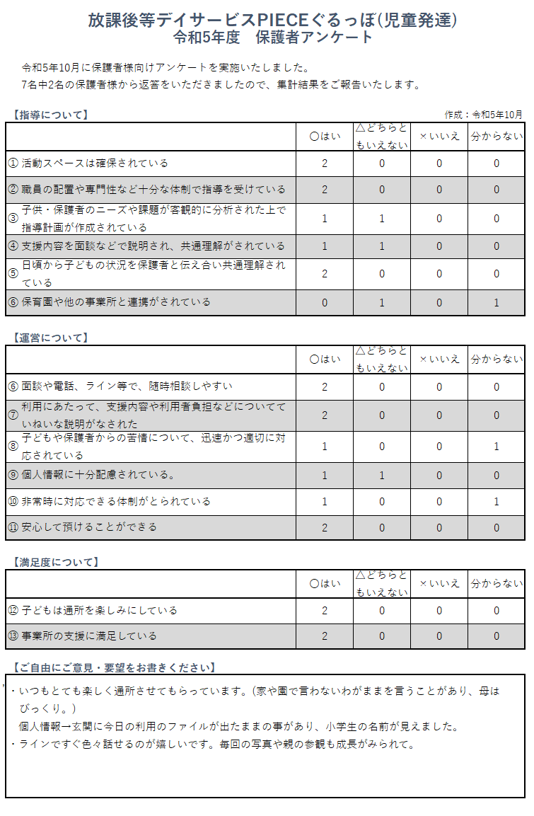 児童発達支援【PIECEぐるっぽ】R5年度保護者アンケート結果のご報告