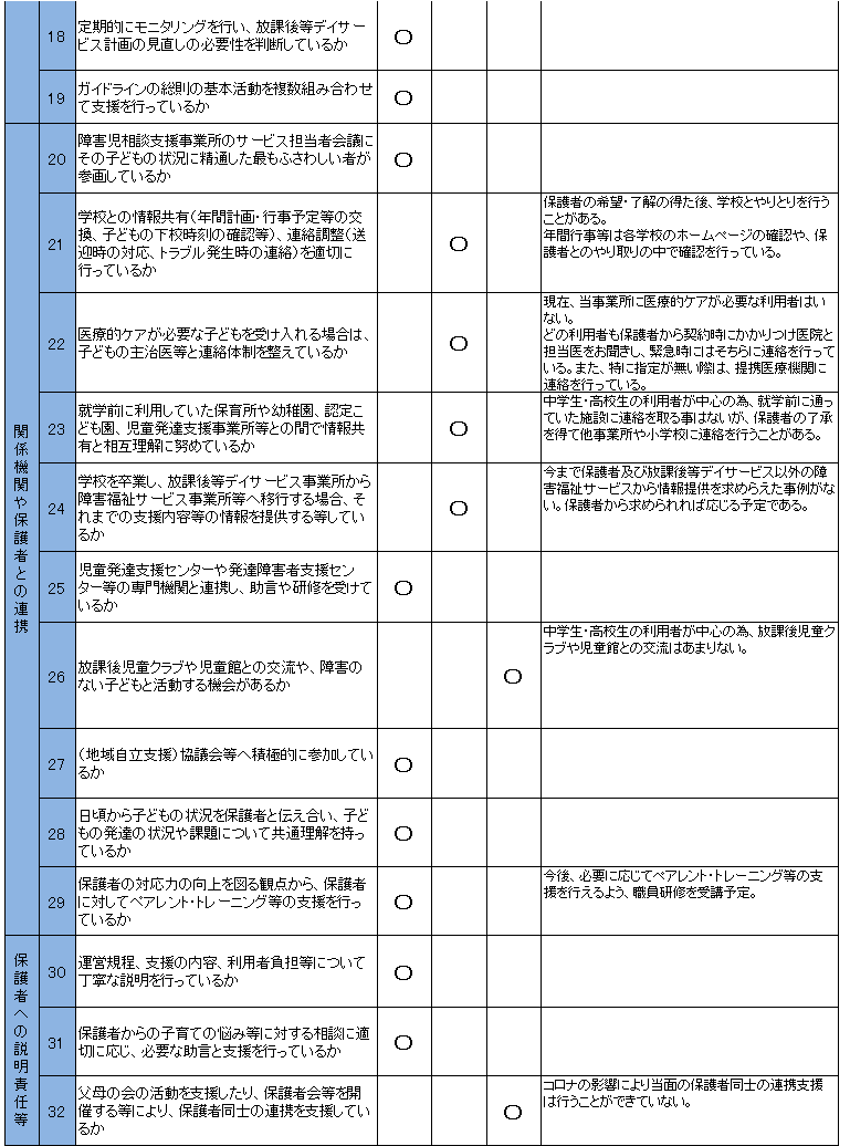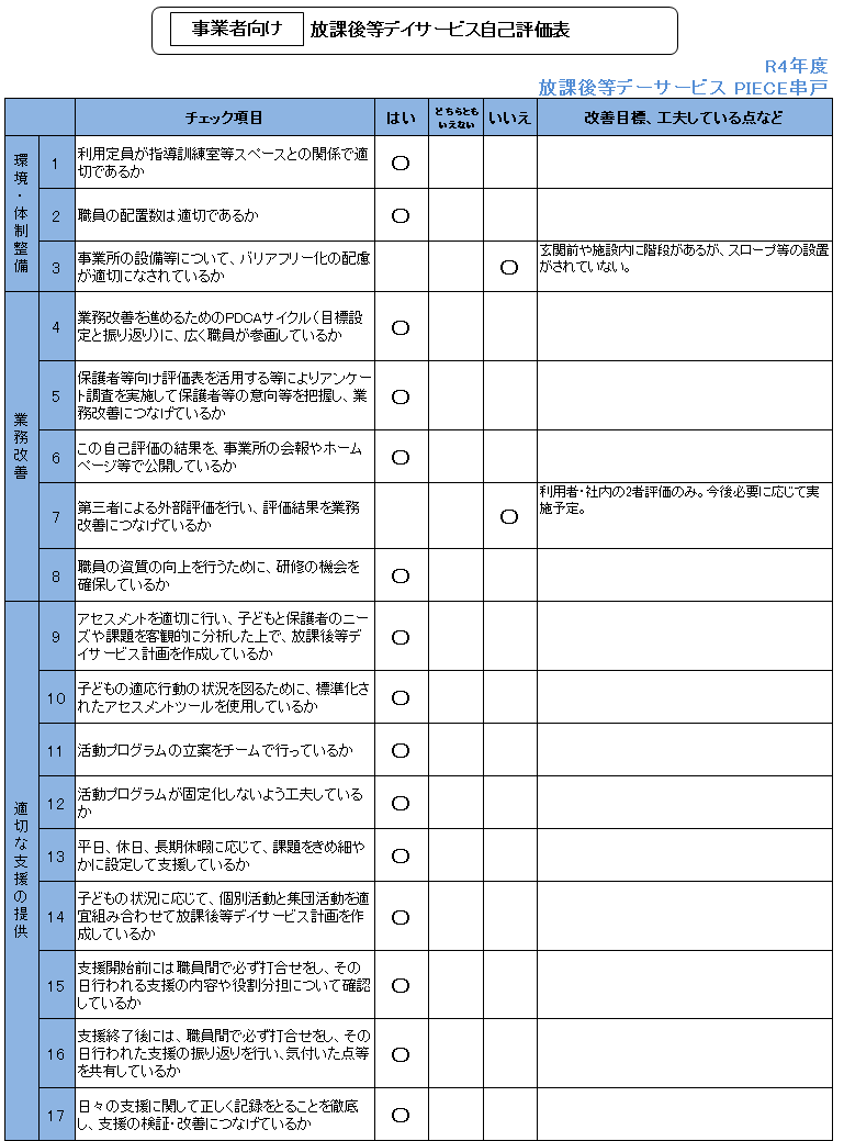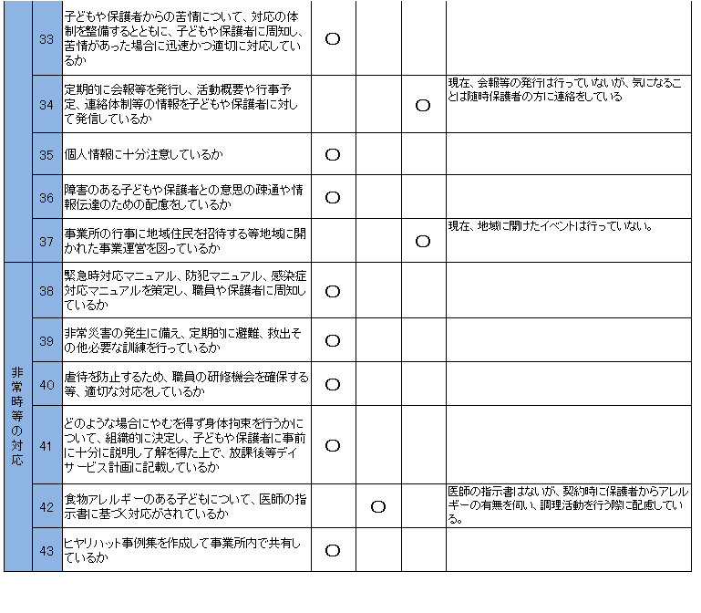 この自己評価表は、支援の質の向上のため、厚生労働省のガイドラインに沿って作成されたものです。
