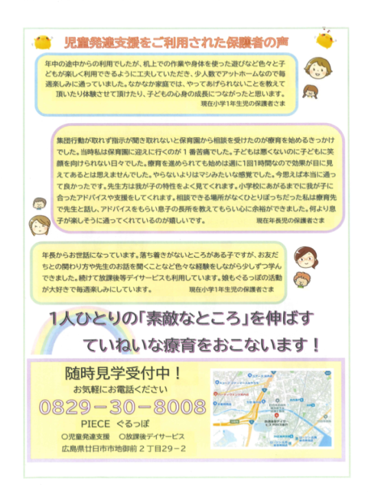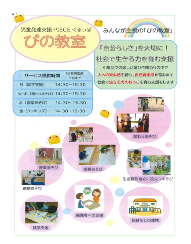 療育を受けるならできるだけ早い時期から。PIECEでは児童発達支援をより充実させていけるように考えています。ぴの教室は2年前から細々と始まっていますが、ずっと通ってきてくれている子どもたちの成長ぶりには、スタッフ全員喜びを感じています。曜日によってテーマを決め、好きなことを通しての療育支援を行っていきます。