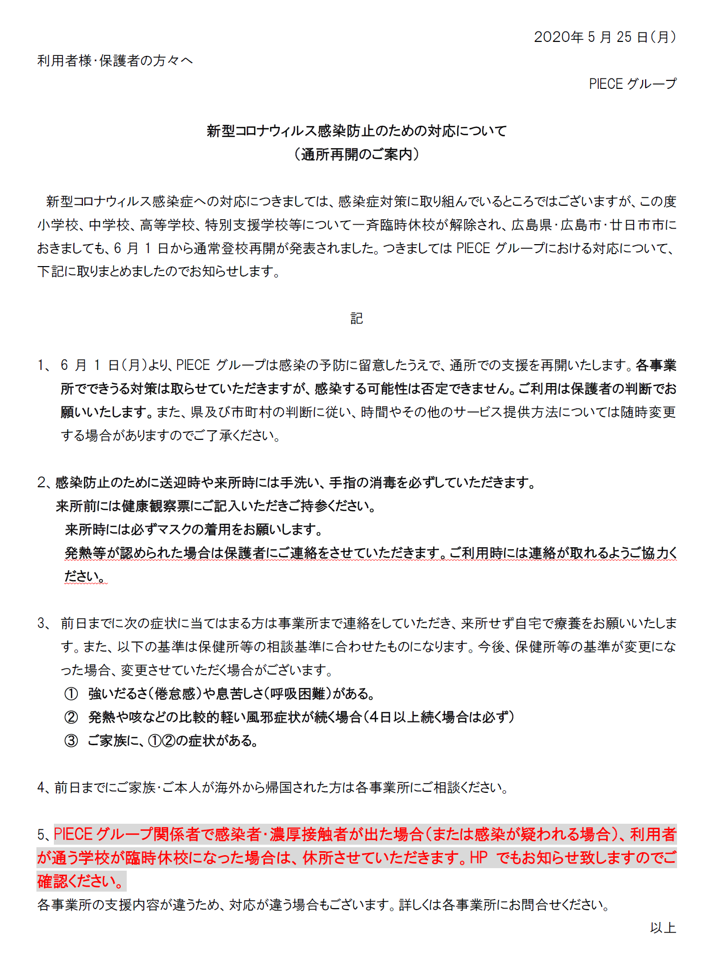 PIECEグループ全体の対応をまとめました。詳細はご利用いただいている各事業所にご確認ください。