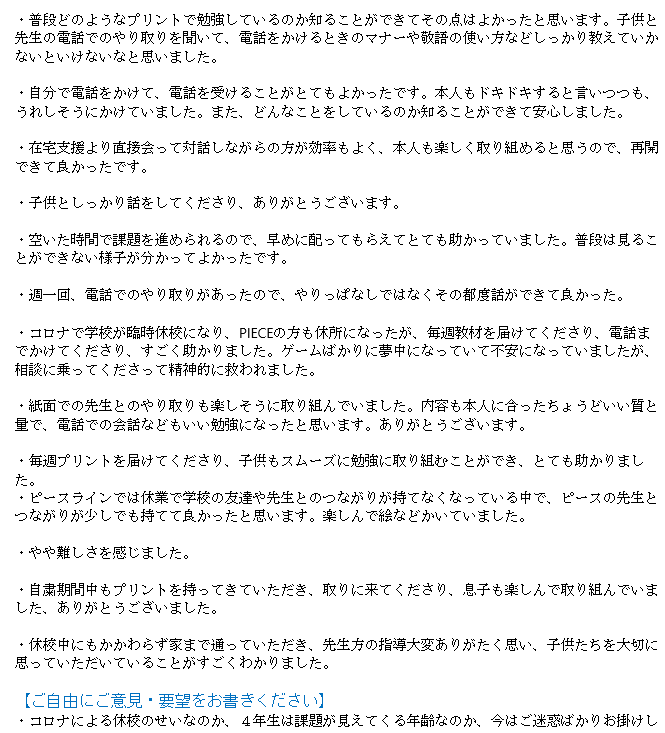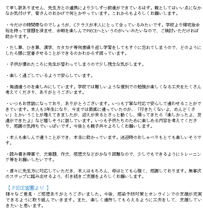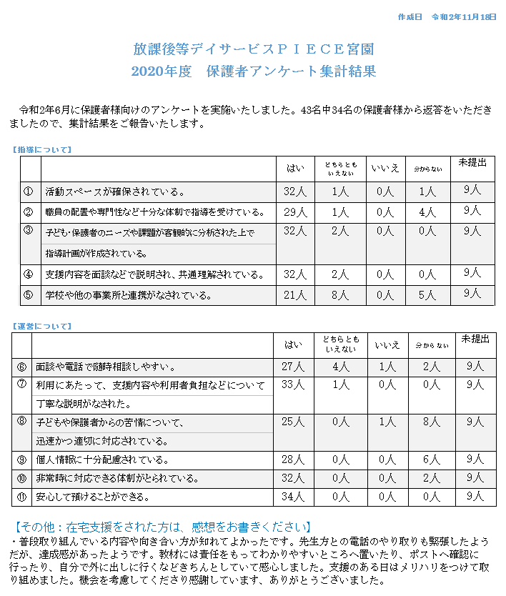 【PIECE宮園】R2年度 保護者アンケート結果のご報告