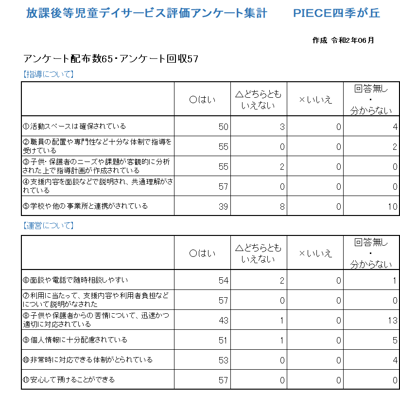 【PIECE四季が丘】R2年度保護者アンケート結果のご報告